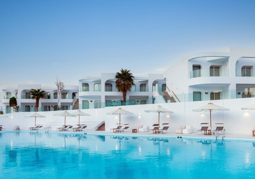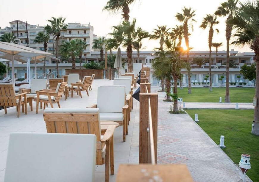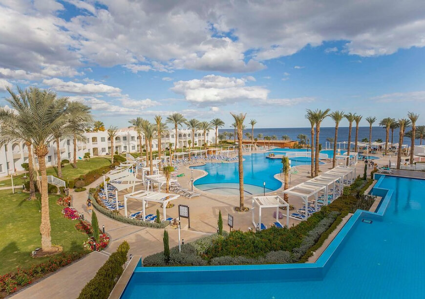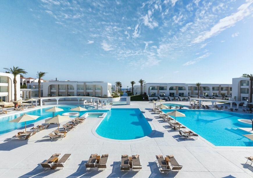 Классный отель в Шарме – построен в 2022 году. Просторная территория, все постройки белого цвета – отдаленно напоминает Санторини. Шикарный риф, вход в воду с пирса